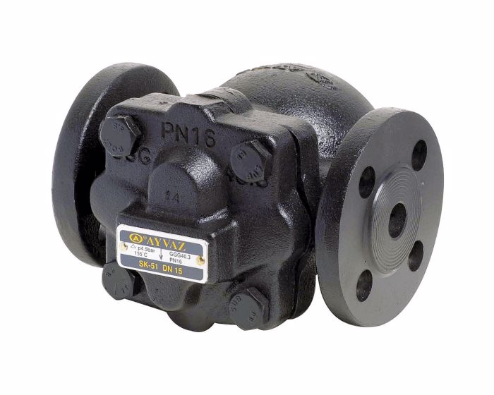 SK 51 menetes karimás úszós, gömbgrafitos öntöttvas gőzleválasztó, automatikus légtelenítő úszóval, gömbgrafitos öntöttvas test (EN-GJS-400-18), beépített termosztatikus légtelenítő, PS: 16 bar, TS: 250°C, G menetes.